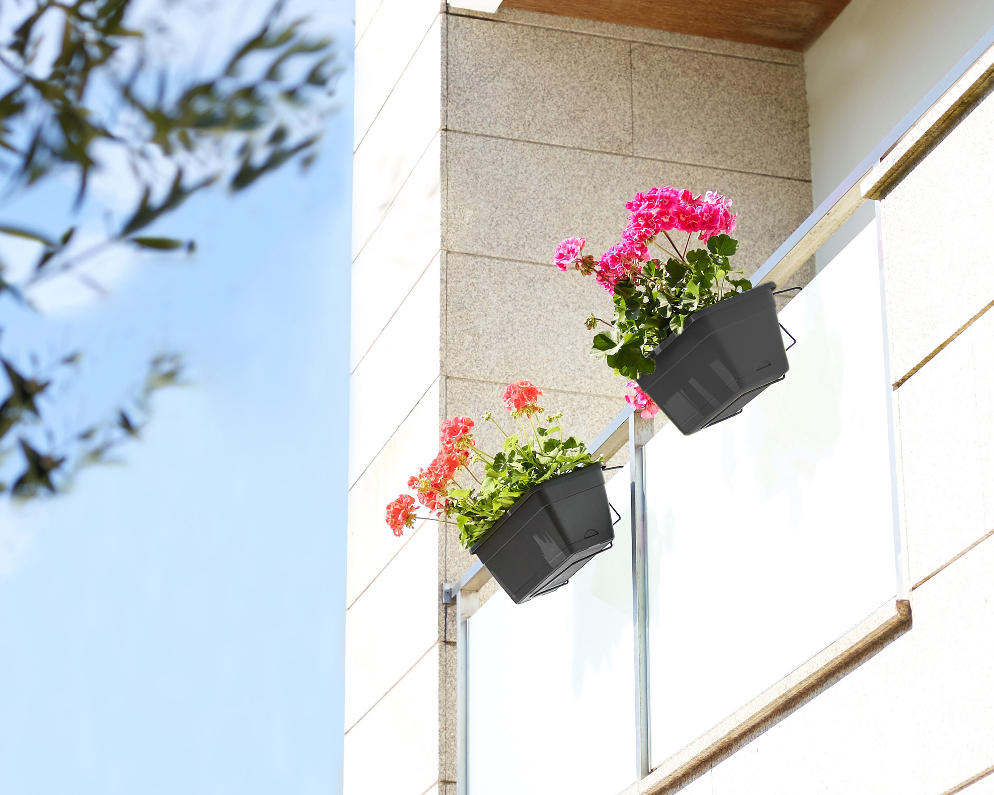 Recycled plastic plant box kit for the balcony, made from polypropylene. Lightweight, durable, recyclable and reusable. Includes drainage hole with plug, stabilisation piece and water reserve tray. With UV protection and frost-proof. Suitable for balconies, with a capacity of 2,4 litres. Made in Portugal.