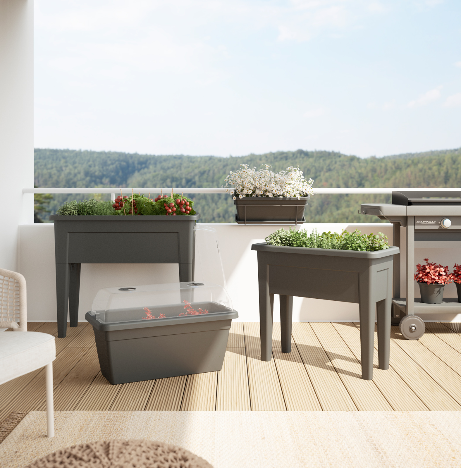 Recycled plastic plant box kit for the balcony, made from polypropylene. Lightweight, durable, recyclable and reusable. Includes drainage holes, iron stabilising piece, saucer and fixing clips. Plant box with UV protection and frost-proof. Suitable for balconies, with a capacity of 18 litres. Made in Portugal.