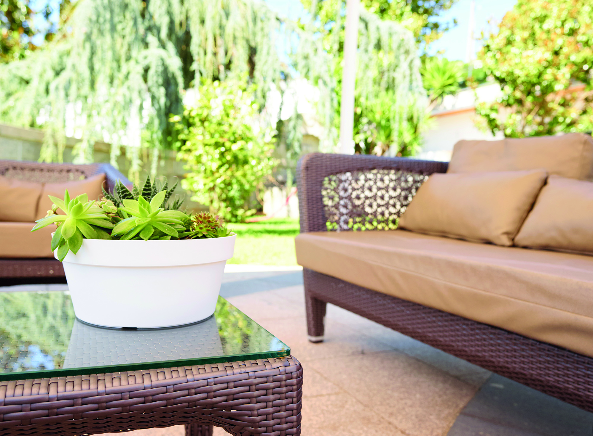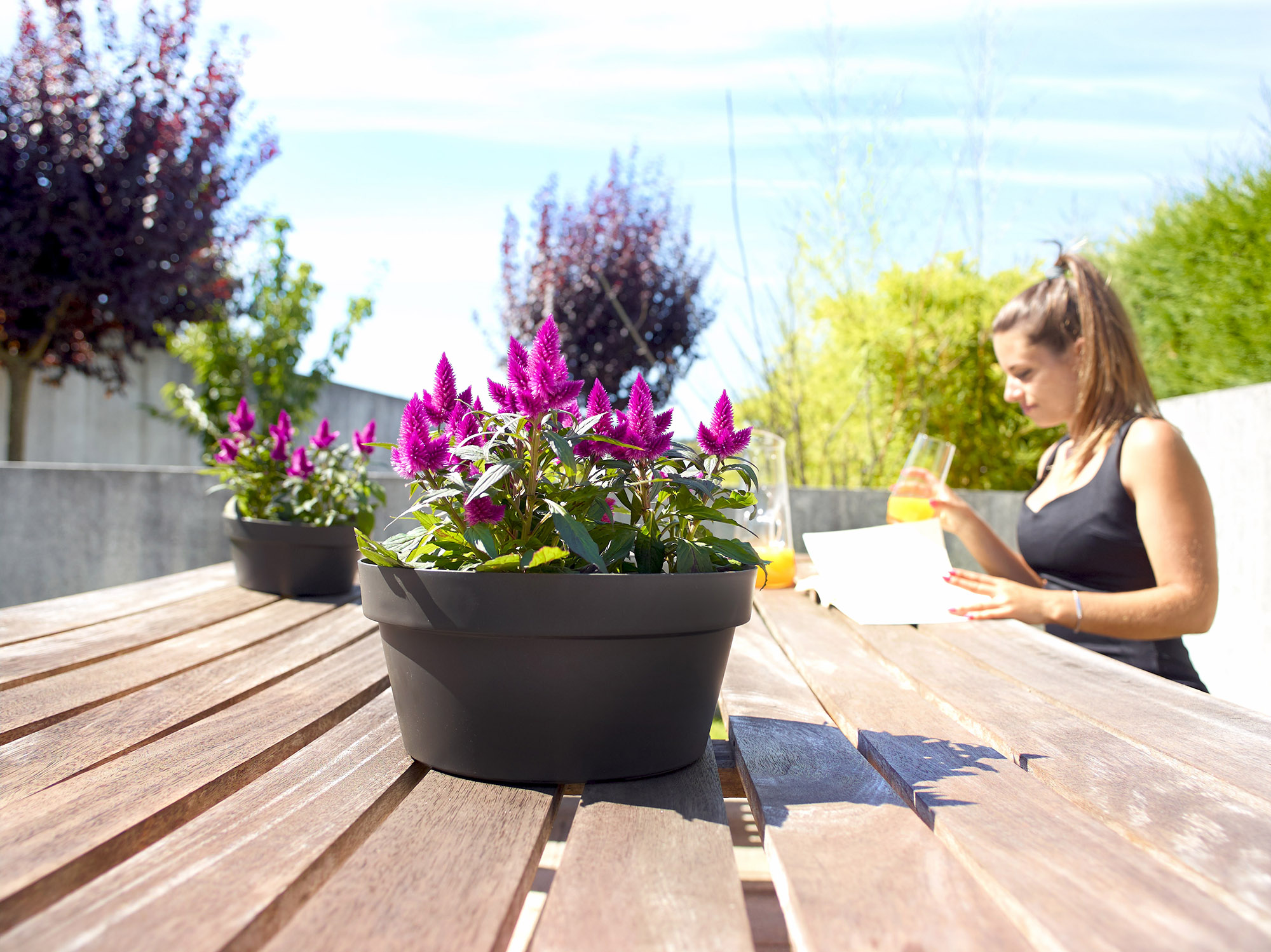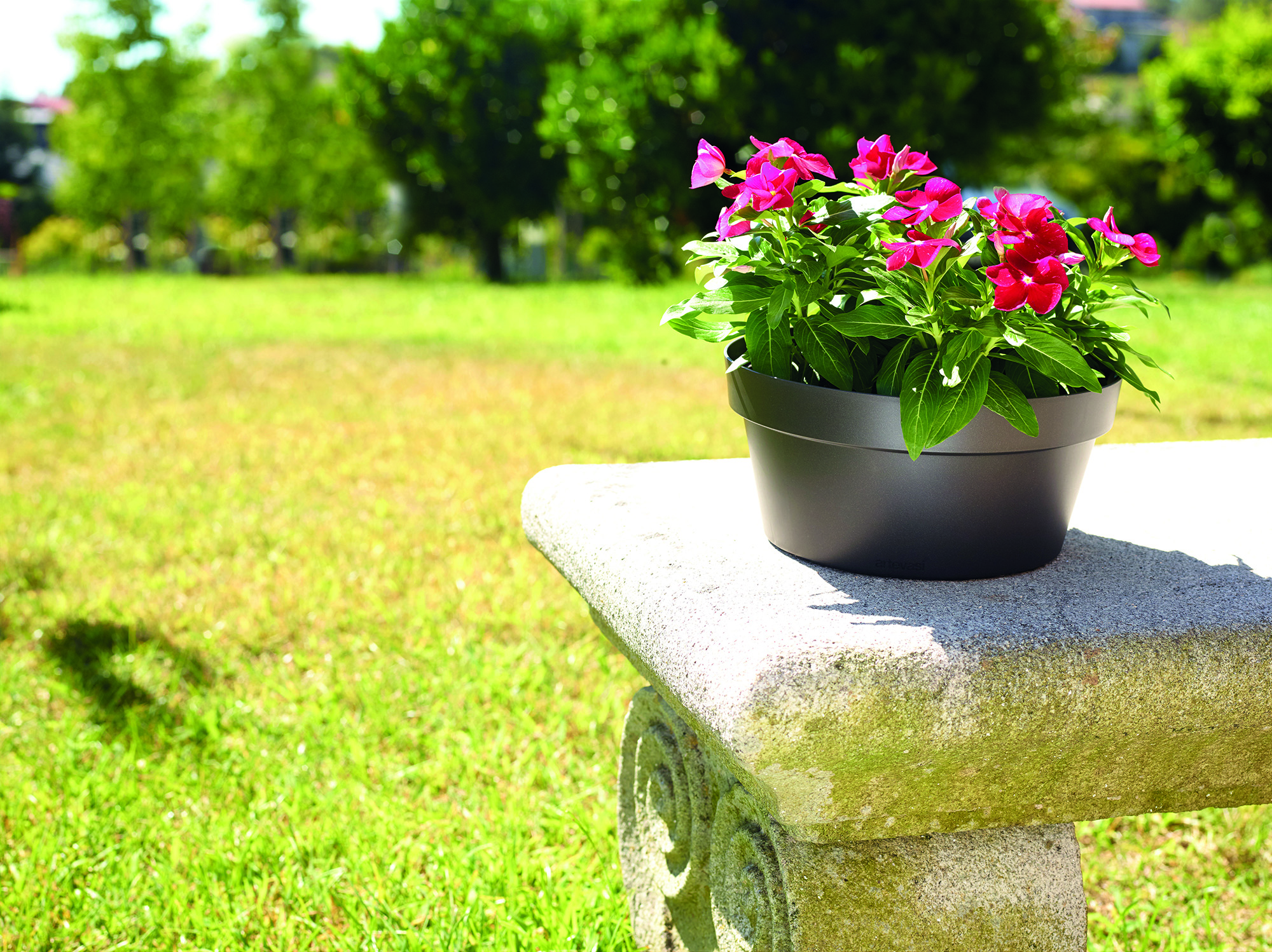 Taça de plástico reciclado, fabricada em polipropileno, leve, durável, reciclável e reutilizável, com proteção UV, à prova de gelo e com orifício pré-perfurado para drenagem. Adequado para espaços exteriores e interiores, com capacidade de 4,4L. Complementável com prato redondo, para uso interior. Produzido em Portugal.